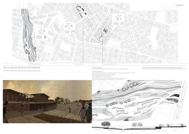 Les espaces délaissés, espaces de vie communs, accueilleront un jardin de quartier équipé d’une infrastructure de production afin d’envisager l’autosuffisance du quartier et une sensibilisation aux problèmes sanitaires et environnementaux. Chaque programme doit donc trouver un équilibre entre l’existant et l’innovation : les ressources locales, les habitudes traditionnelles, les besoins et l’inventivité.