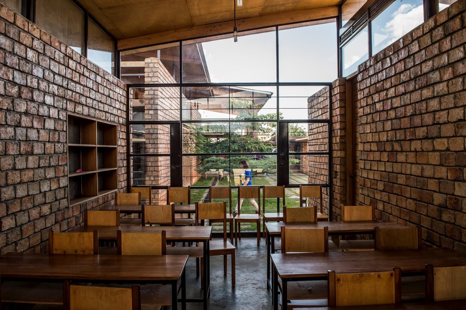 Tous les matériaux et toutes les technologies de construction ont été achetés localement – dans le respect de la culture locale. Les briques rouges panachées ont été soigneusement sélectionnées et les murs soigneusement construits. C’est parce que le poids visuel et l’épaisseur confèrent au bâtiment un sentiment de sécurité, comme le tronc d’un grand arbre profondément enraciné dans la terre, ce qui donne envie aux gens de le toucher ou de s’appuyer dessus. Les architectes locaux ont pris un soin particulier à travailler avec les charpentiers et les maçons (et à les former) afin d’atteindre un haut niveau de qualité d’exécution, y compris, par exemple, en travaillant avec les maçons dans la fabrication des briques. Grâce au long processus de construction, les maçons et les ouvriers ont trouvé la fierté dans leurs propres briques qu’ils pensaient à l’origine sans valeur.