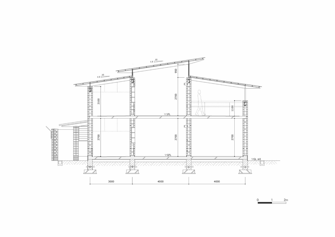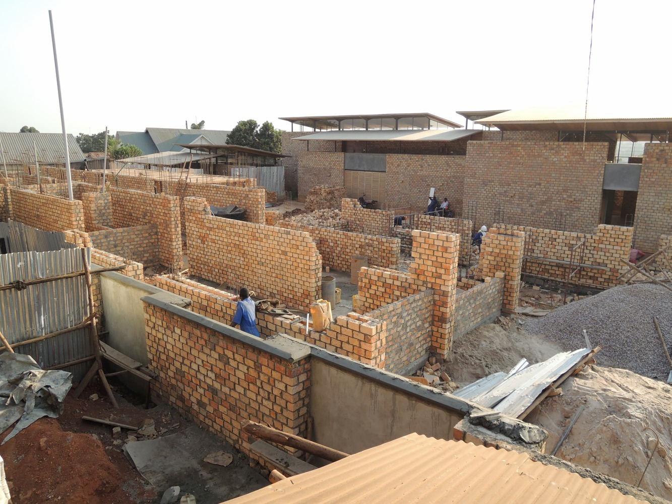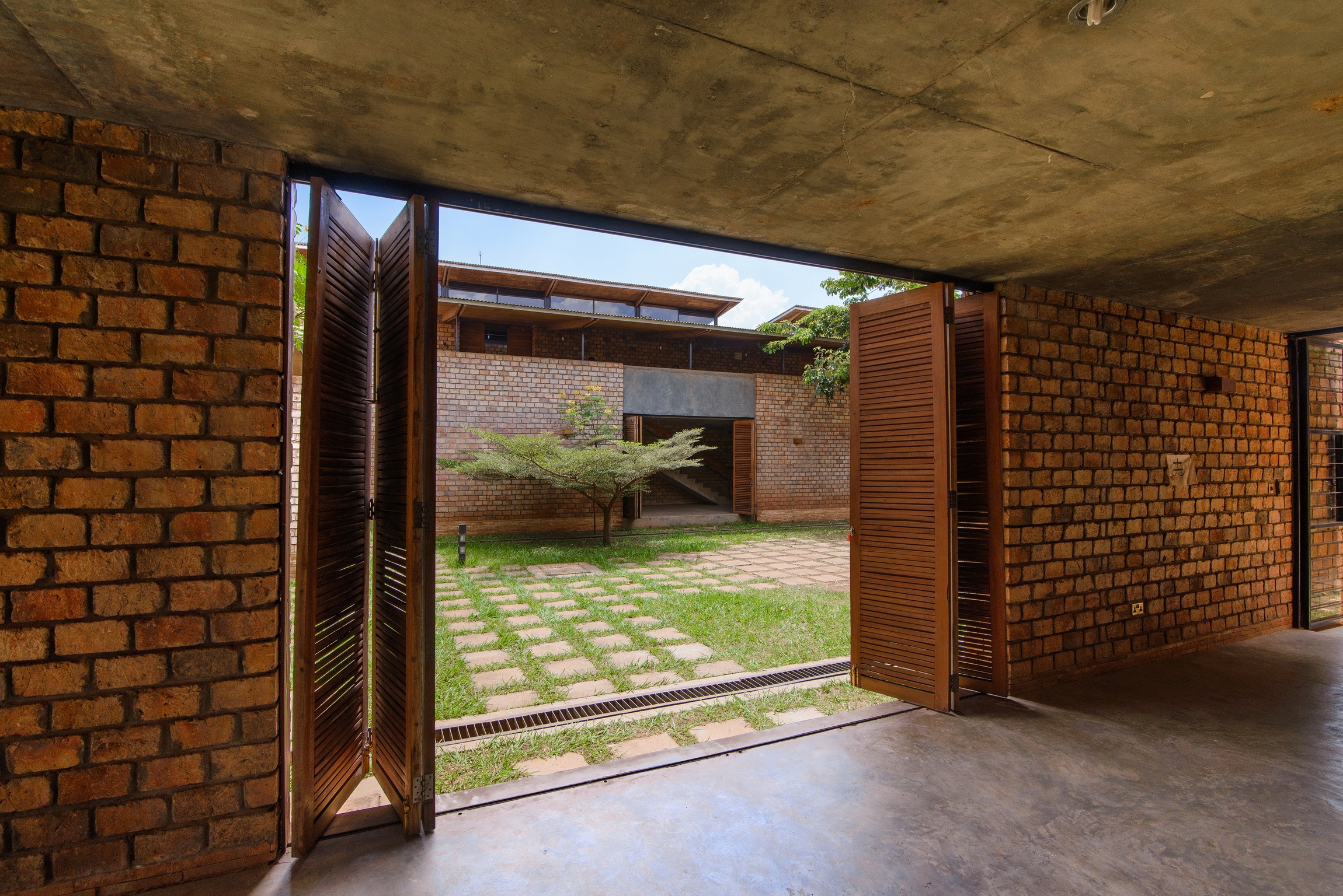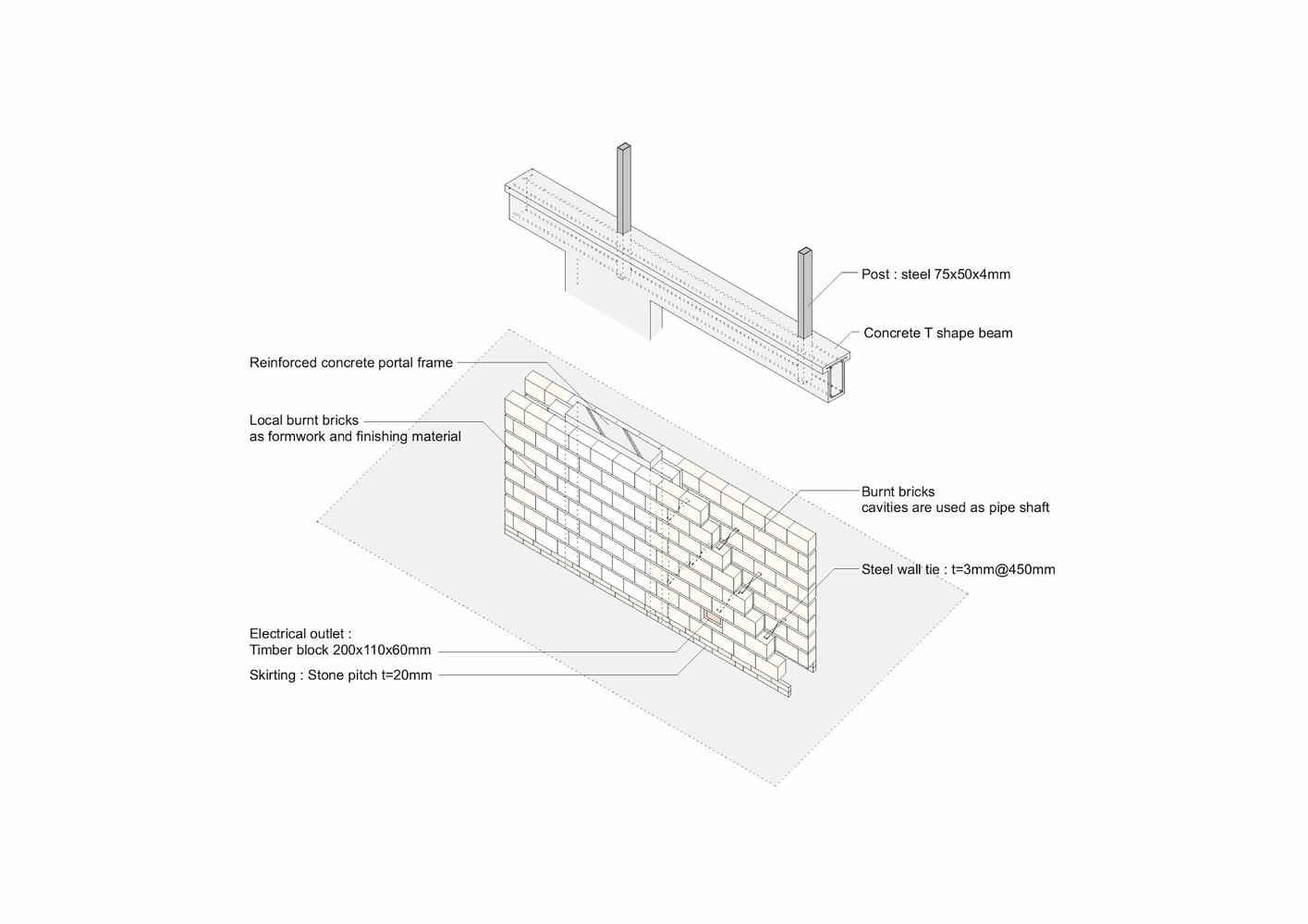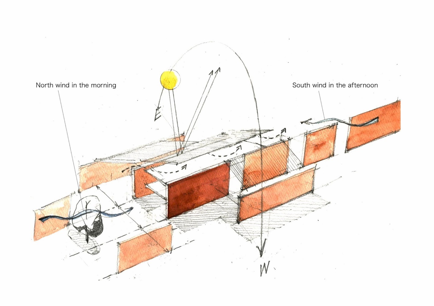 Dans le site clos, le plus grand défi était de garder une bonne distance entre les activités individuelles tranquilles et les activités de groupe. Les pièces qui partagent un espace entre deux murs de briques – des espaces de 3 et 4 mètres de large appelés » baies » – sont réunies, tandis que celles qui se trouvent de chaque côté du mur sont séparées. De plus les portées entre trois ‘baies’ sont assez grandes pour que toute la communauté puisse s’y rassembler. Les architectes japonais ont remarqué que la population locale passait des journées chaudes à l’extérieur – à l’ombre et dans la brise – et ont suivi le même principe en plaçant de longs murs sur les côtés est et ouest pour donner de l’ombre, et en faisant de grandes ouvertures sur les façades nord et sud pour attirer vent et lumière profondément dans les pièces. Les cadres en béton permettent ainsi de grandes ouvertures et supportent des poteaux d’acier qui retiennent la toiture en treillis de bois recouverte de tôle.