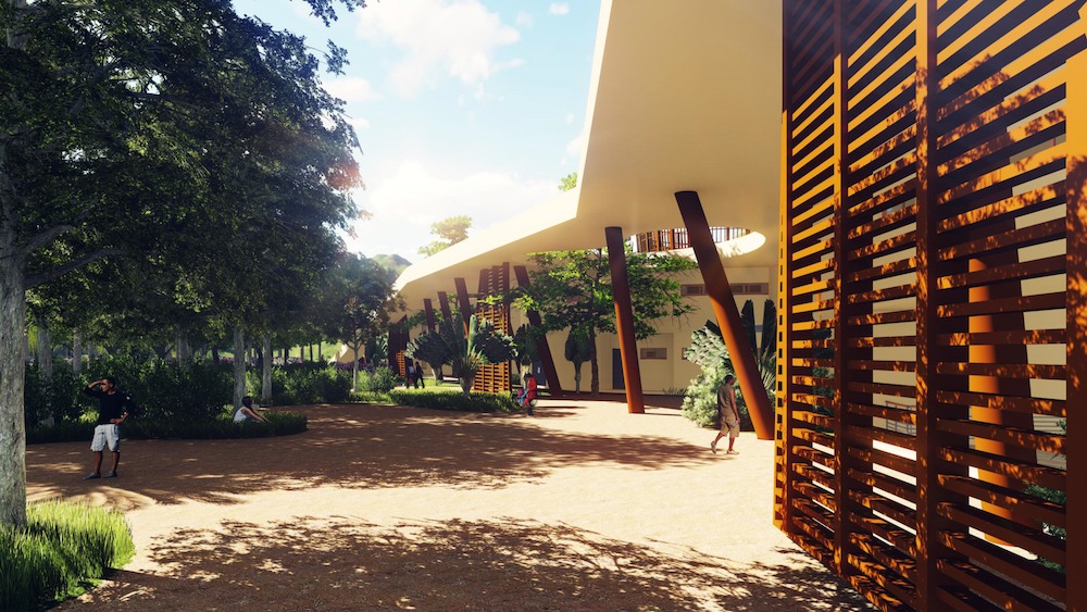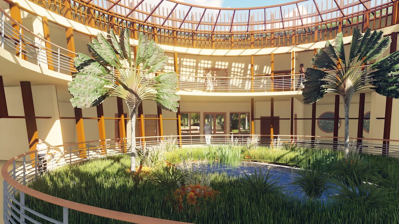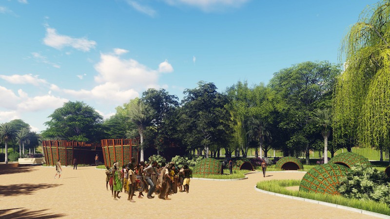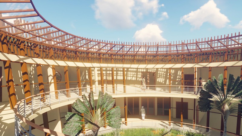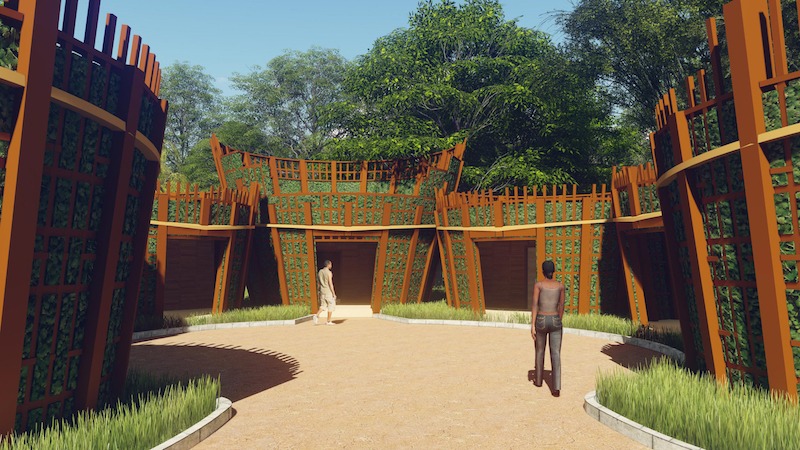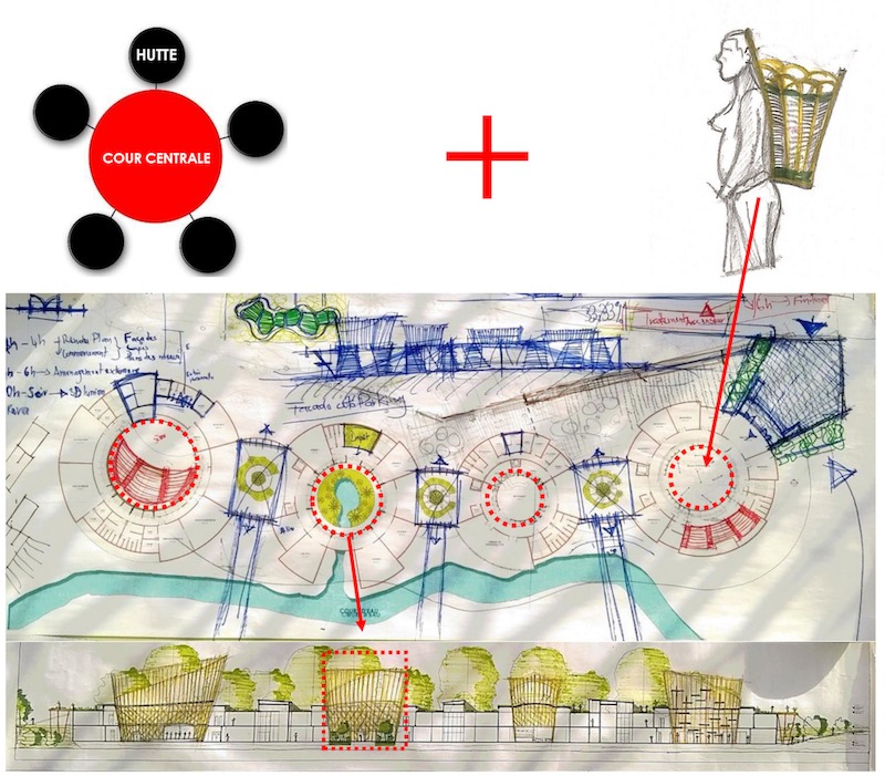 En se plongeant dans la culture pygmée, nous avons été impressionnés par leur mode de vie. Nous nous sommes rendu compte que la centralité est la base de la société, que ce soit dans la constitution d’un campement, ou même les activités quotidiennes festives à savoir les contes, les chants et les danses. Et aussi le sac de cueillette « Nzangi » qui est très important car il permet le transport de toutes choses y compris le port des bébés par les femmes pour exercer leur activités (chasses, cueillette et pêche artisanale). Ainsi, la première idée en présence du terrain situé à Mbaïki, dans le Sud-Ouest du Centrafrique (une zone à forte présence des pygmées), était que l’on retrouve cette centralité en plusieurs entités de fonctions différentes et animées en un parcours susceptibles de créer une image architecturale en termes de formes, de textures et de matériaux qui s’intègrent dans l’environnement.