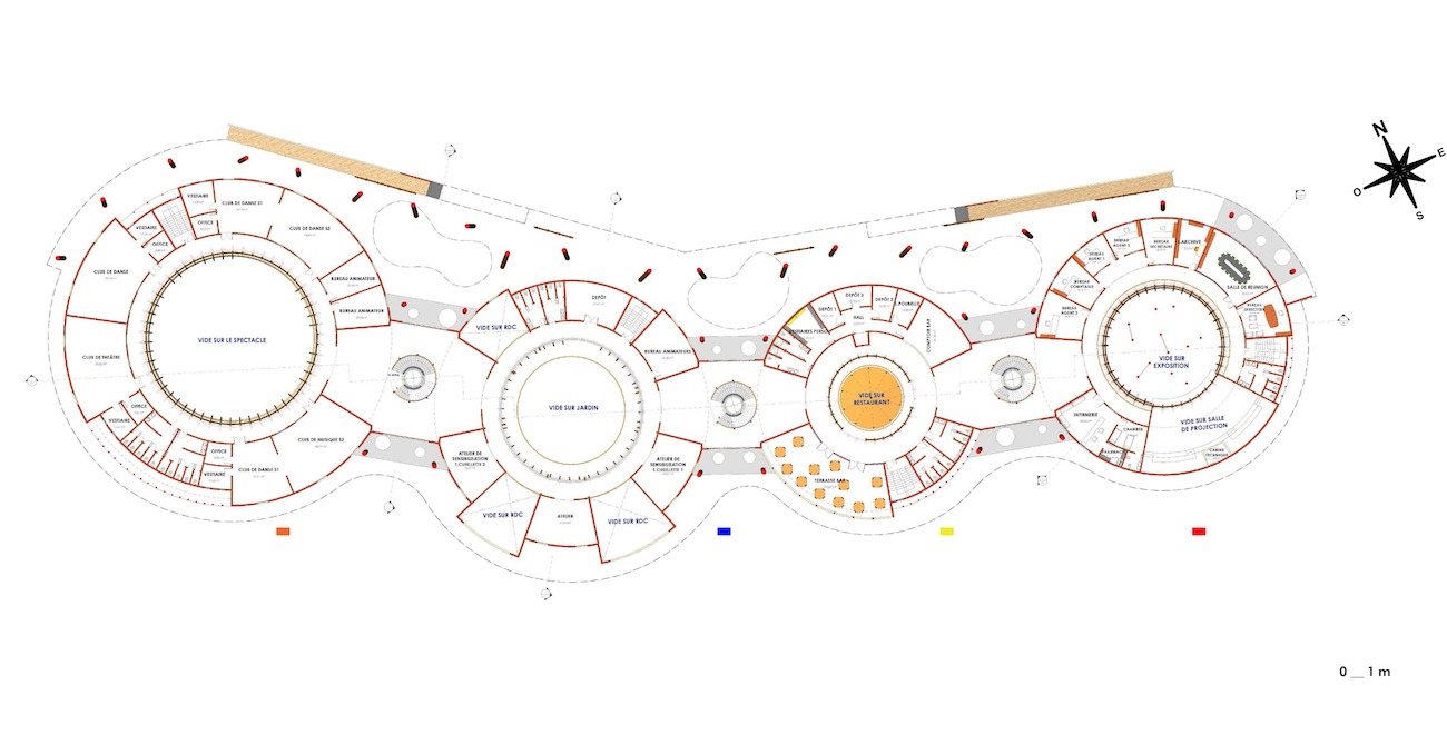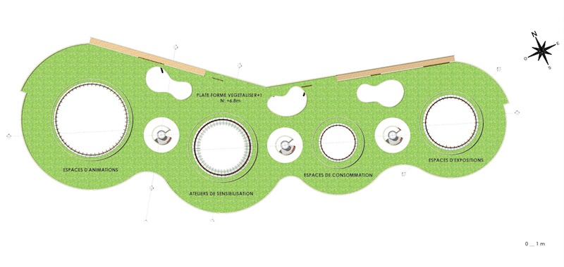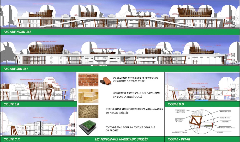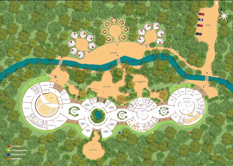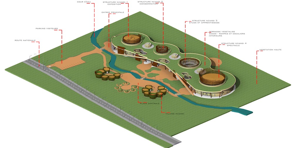 Le programme est matérialisé par quatre entités centrales de fonctions différentes et relié par des unités de circulations horizontales et verticales, décrivant une scène de parcours pour permettre aux visiteurs de découvrir cette culture. Chaque entité a une fonction et regroupe plusieurs espaces concernés. En outre, la notion de centralité dans le projet est exprimée par une structure en bois « lamellé-collé », rappelant le sac de cueillette pygmée « Nzangi ». Cette technique est adaptée aux zones forestières et permet aussi de développer des procédés de construction non utilisés encore en Centrafrique. Ainsi, afin de rendre le projet plus autonome, nous avons créé des unités d’habitation « villages Nzangi » pour les personnes qui voudront passer quelque jours dans l’apprentissage et un campement pygmée qui les accompagne.